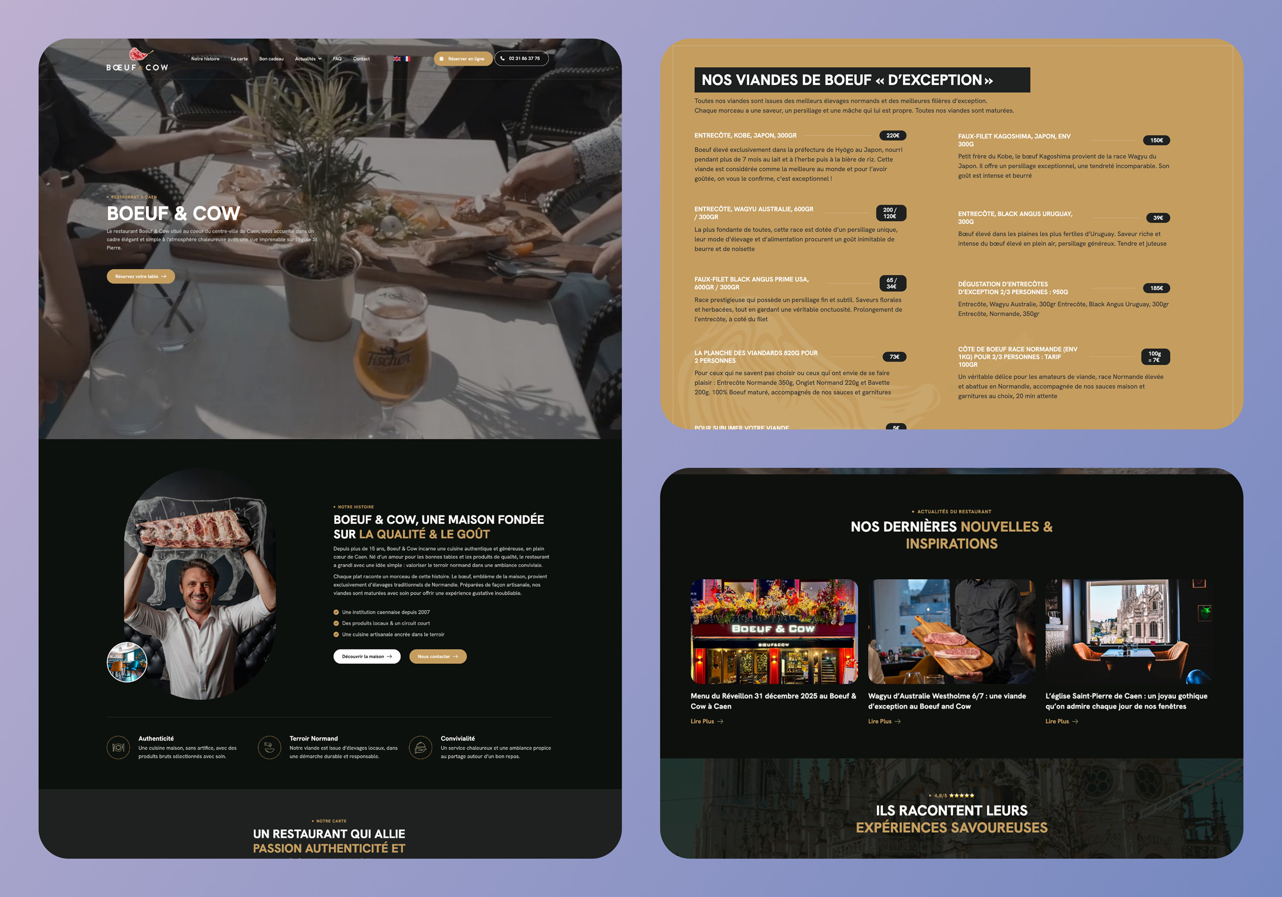 L’objectif pour Bœuf & Cow n’était pas de simplement « refaire un site », mais de faire évoluer leur présence digitale sans toucher à l’âme du lieu. Il s’agissait de traduire l’ambiance chaleureuse du restaurant — grillades, bons vins et convivialité — dans une interface web fluide et moderne.